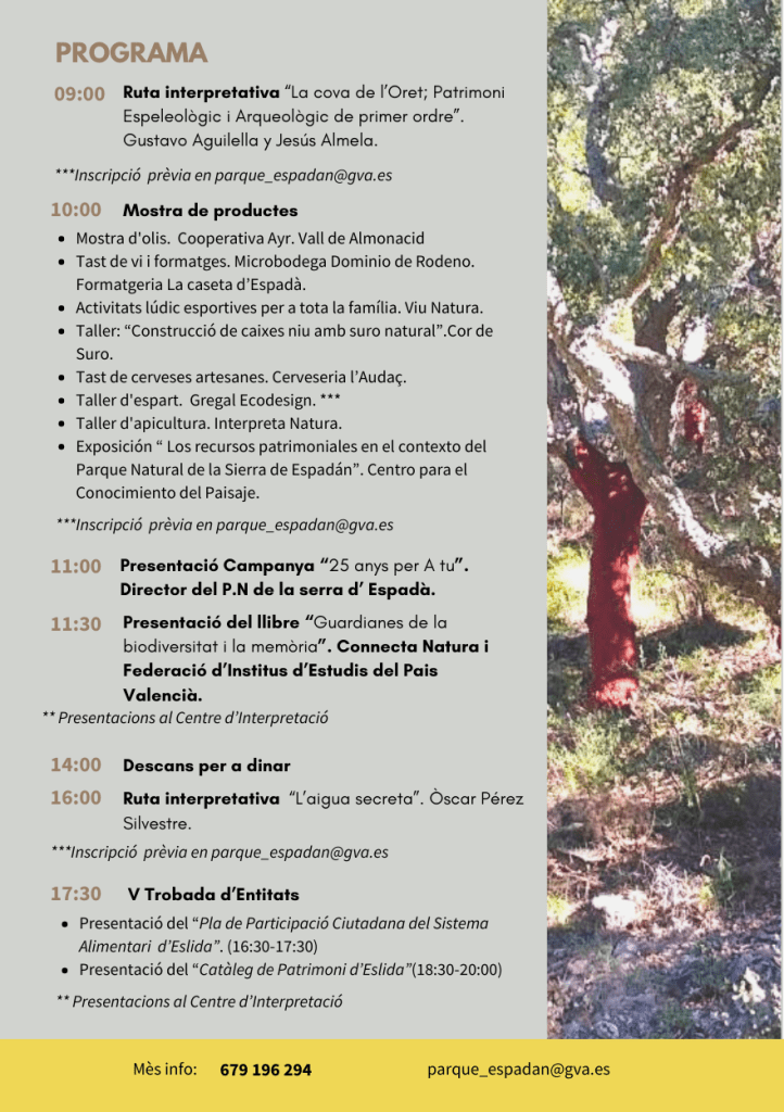 Com és tradició s’organitzarà al matí la fira de productes, artesania, pobles i associacions. La jornada inclourà tast de cerveses artesanes, oli, formatge, vi i mel. I s’organitzaran tallers sobre suro, apicultura i espart. Després de la pausa del menjar tindrà lloc la V Trobada d’Entitats, l’excusa per a reunir-nos de manera informal i presentar noves iniciatives que s’estan desenvolupant al parc natural. Realitzarem una visita guiada per l’entorn del municipi el fil conductor del qual serà l’aigua, donarem a conéixer el Pla de Participació Ciutadana sobre el Sistema Alimentari d’Eslida i se presentarà el Catàleg del Patrimoni d’Eslida.