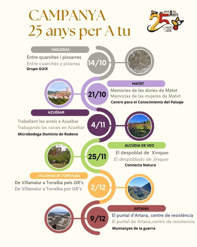 Durante toda la jornada los asistentes pudieron participar en diferentes actividades entre las cuales destacaron el acto homenaje al escritor y profesor de Artana, Joan Pla; charlas, talleres de artesanía, degustaciones y gastronomía local, música y actividades deportivas y culturales, como un rocódromo con tirolina gestionado por la empresa «Viunatura«. El equipo de gestión del Parque Natural valora «de forma positiva el encuentro, puesto que todas las propuestas tuvieron el aforo completo y los asistentes pudieron también probar productos de proximidad y de la Marca Parcs Naturals como aceite, queso, mermeladas, miel, pan, dulces y cocas de hornos tradicionales, vino, cerveza artesana, etc.».